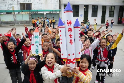 9月25日下午,河南南陽(yáng)市第十八小學(xué)的小學(xué)生在歡呼慶祝我國(guó)的“神七”即將發(fā)射。當(dāng)天,“神七”任務(wù)總指揮長(zhǎng)常萬(wàn)全的家鄉(xiāng)——南陽(yáng)市臥龍區(qū)在以各種方式祝福“神舟七號(hào)”飛船發(fā)射計(jì)劃圓滿成功。世界矚目的“神舟七號(hào)”飛船將于當(dāng)晚發(fā)射。中新社發(fā) 熊運(yùn)彬 攝