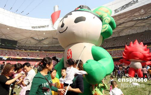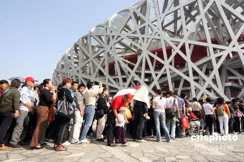9月30日,“十一”國慶長假第二天,旅游黃金周進(jìn)入高潮,到北京旅游的各地游客都渴望進(jìn)入北京奧運(yùn)會(huì)主體育場“鳥巢”,有幸購到參觀票的游客在鳥巢盡情玩耍拍照。中新社發(fā) 吳芒子 攝