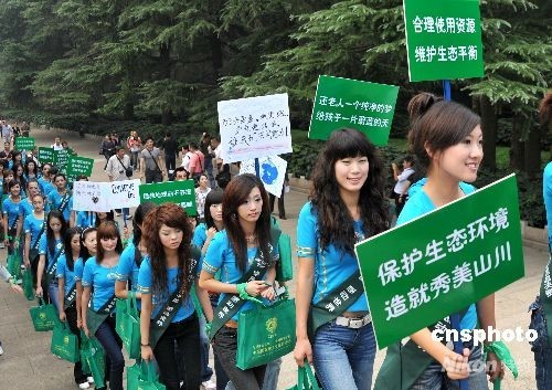 2008年10月3日,參加“中國(guó)國(guó)際年度綠色風(fēng)云人物”頒獎(jiǎng)盛典暨“MISS EARTH世界綠色環(huán)保大賽中國(guó)總決賽”的來(lái)自全國(guó)27個(gè)省、直轄市、自治區(qū)的40位“綠色天使”手拿宣傳牌、環(huán)保袋等物品來(lái)到南京中山陵風(fēng)景區(qū),參加公益環(huán)保宣傳活動(dòng)。中新社發(fā) 劉建民 攝