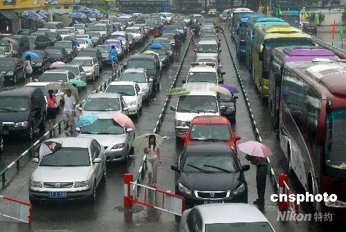 2008年10月4日消息,海南受今年第17號熱帶風暴“海高斯”影響開始漸弱,瓊州海峽不同抗風等級的船舶陸續復航。來自廣東、廣西、云南、福建等省的自駕車游客結束黃金周休閑游,開始返程過海,在海口秀英港等候乘船過海的自駕車排成了長龍。中新社發 善平 攝