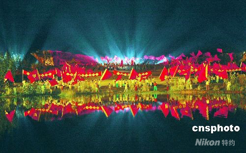 十月六日晚八時,江西省首個大型戶外實景演出《井岡山》,再現當年八十年前紅軍挑糧上井岡山情景。這場《井岡山》的演出由近千名當地農民參演,采用一千多盞燈光、五萬五千多平方米的舞臺。中新社發 段長征 攝