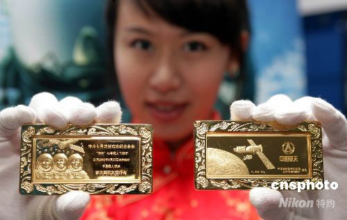 10月9日,為紀念神舟七號成功發射和中國首次太空行走圓滿成功,作為國家紀念 “神七”飛天活動的重要組成部分,中國航天部門首次面向全球發行“金鑲鉆神七金條”。“金鑲鉆神七金條”分45克、90克、300克和1000克四種規格,全部采用999純黃金制作,正面的主體圖案為三位宇航員肖像,背面為神七飛船和宇航員出艙行走的風姿,這在中國航天史上尚屬首次。中新社發 趙雋 攝