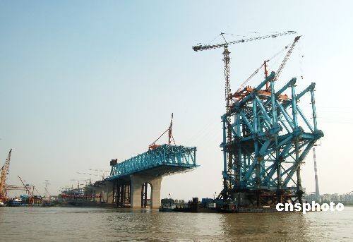 10月13日,江蘇南京,中鐵大橋局的建設者們正在京滬高速鐵路南京大勝關特大跨江大橋上對橋面鋼梁進行架設。南京大勝關大橋是京滬高速鐵路最大的一座跨江大橋,自2006年7月開工建設以來,主橋的5號、6號橋墩,9號和10號橋墩均以完成鋼梁的架設,南北引橋分段開始對簡支梁和連續梁的混凝土澆注,3300人不分晝夜奮戰在大橋建設第一線,預計到2009年11月30日前可完成全部橋梁的架設。中新社發 豐成 攝