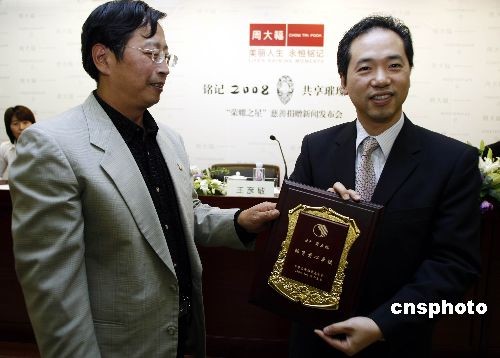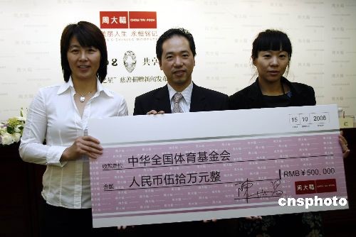 10月15日,著名珠寶品牌周大福在國(guó)家體育總局,舉行名為“銘記2008,共享璀璨榮耀”的慈善捐贈(zèng)新聞發(fā)布會(huì),宣布將周大福Forevermark永恒印記“榮耀之星”的部分拍賣款項(xiàng)50萬(wàn)元人民幣,捐助予“中華全國(guó)體育基金會(huì)(中國(guó)運(yùn)動(dòng)員委員會(huì))”,這也是該委員會(huì)成立以來(lái)的首筆社會(huì)愛(ài)心團(tuán)體的公益捐贈(zèng),此筆善款將用于支持該委員會(huì)開展體育公益工作,以號(hào)召更多企業(yè)關(guān)注和支持中國(guó)體育事業(yè)發(fā)展。周大福董事陳世昌先生、國(guó)家體育總局體育基金管理中心副主任、中華全國(guó)體育基金會(huì)副理事長(zhǎng)王彥敏先生與著名運(yùn)動(dòng)員周繼紅女士(國(guó)家體育總局游泳運(yùn)動(dòng)管理中心副主任、運(yùn)動(dòng)員委員會(huì)主任委員),錢紅女士(游壇“五朵金花”之一),高紅(“鏗鏘玫瑰”之一、老國(guó)家女足守門員)均蒞臨現(xiàn)場(chǎng)。此前拍賣的Forevermark永恒印記“榮耀之星”27.16克拉梨形美鉆,作為周大福專為2008年北京奧運(yùn)會(huì)獻(xiàn)禮之作,脫胎于重達(dá)70克拉的南非原產(chǎn)鉆胚。更為珍貴之處在于在其臺(tái)面上印記有源自周大福鉆石原胚全球合作伙伴——世界最大的鉆石原胚供應(yīng)商戴比爾斯集團(tuán)的“Forever mark”永恒印記”,其中特別珍選并全球唯一的“20080808”序列號(hào)碼,特別銘記2008北京奧運(yùn),銘記中華體育世紀(jì)盛事。中新社發(fā) 楊可佳 攝