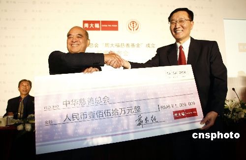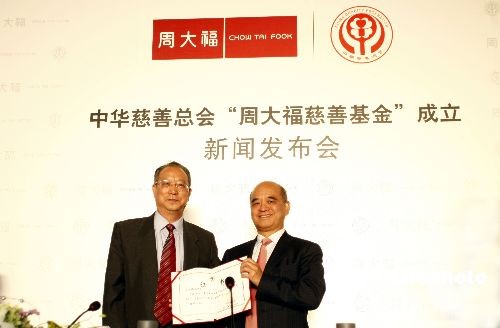 10月中旬,周大福集團與中華慈善總會在京召開新聞發(fā)布會,宣布 “周大福慈善基金” 正式成立。發(fā)布會上,全國政協(xié)常委、中華慈善總會榮譽會長、周大福集團董事總經(jīng)理鄭家純博士代表周大福集團,向中華慈善總會轉交了“基金”首筆慈善捐款150萬元,用以啟動開展“基金”第一階段助學助孤慈善項目。全國人大代表、中華慈善總會副會長李本公,中華慈善總會副會長張道誠,中華慈善總會秘書長劉國林,副秘書長韓京津出席了儀式,并向鄭家純博士頒發(fā)了捐贈證書和榮譽會長證書。中新社發(fā) 楊可佳 攝