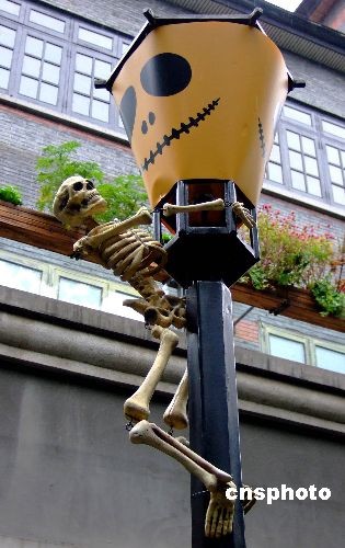 2008年10月29日,為迎接2008萬圣節,上海新天地酒吧街已完成全程置景的設計布置,以綿延酒吧街數十處的萬圣置景,為游客“講述不怕鬼的故事”。南瓜頭鬼,白骨嶙峋鬼,美女鬼,小丑鬼……在路邊、酒桌上、樹頂、草地里、燈桿上、石庫門陽臺間,夸張得有趣,吸引游人目光。中新社發 蔣振雄 攝