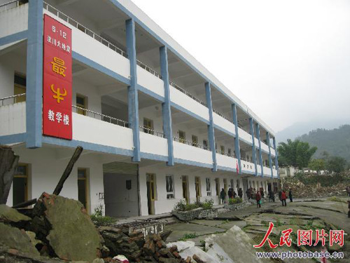 2008年10月,一批來自成都市的游客正在“5·12”汶川大地震“最牛”教學樓地震遺跡內參觀。據悉,“5·12”汶川大地震發生后,一條地震斷裂帶剛好從四川省彭州市白鹿鎮中心校校區內穿過,從而導致一棟新建教學樓被整體抬高近3米,樓體依然屹立原地不倒;而在其旁邊的教師宿舍完全垮塌,舊教學樓、辦公樓均成危房,與“長高”的新教學樓相對10多米遠、且在同一時間施工建設、同一地面高度的一棟四層新教學樓,成了鮮明的參照物。會“長高”的教學樓便被當地人稱作是:“5.12”汶川特大地震“最牛”的教學樓。彭州市相關部門特將此校教學樓地震遺跡作為旅游資源開發利用。目前,每天都有二三百人的游客來此觀光“最牛”的教學樓地震遺跡。