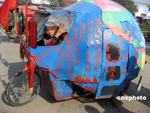 11月10日,一個(gè)地球模樣的三輪車來(lái)到安徽省亳州市宣傳環(huán)保,吸引市民駐足觀看。38歲的江西小伙蔣桂山自去年6月5日從江西九江開(kāi)始,騎著自制的直徑一米的地球儀三輪房車宣傳環(huán)保,先后途經(jīng)上海、天津等140個(gè)城市。之后,他來(lái)到安徽亳州講“環(huán)保”。蔣桂山預(yù)計(jì)用4年時(shí)間蹬著“地球車”走遍全國(guó)400多個(gè)城市,向人們宣傳節(jié)約用水、用電和能源,他想用這種特殊的方式引起人們關(guān)注環(huán)保。中新社發(fā) 張延林 攝
