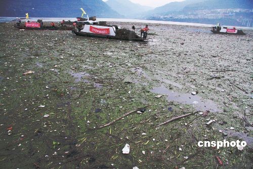 11月10日,重慶市云陽縣環衛部門組織的清漂隊伍在三峽水庫腹心江面緊急打撈。最近一兩天來,大量漂浮垃圾涌入完成試驗性蓄水任務的三峽水庫,在庫區湖灣地帶匯集形成觸目驚心的“垃圾陣”。自三峽工程開展175米蓄水以來,庫區水質和航運正常,生態監測情況良好。但由于受前期三峽庫區大范圍降雨和季風氣候影響,庫區支流、河叉大量漂浮垃圾涌入三峽水庫,在交匯、回水、湖灣等區域集而不散。目前,水庫沿線各區縣啟動緊急應急清漂預案,采取增投力量,人工、機械打撈相結合的辦法,全力清漂,確保安全。中新社發 饒國君 攝