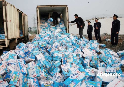 11月10日,在河南省寶豐垃圾處理廠內,伴隨著碾壓機的轟轟開動,68噸不合格奶制品在工商人員的監督下被碾壓銷毀、填埋。三鹿奶粉事件發生后,寶豐工商系統共出動執法人員2103人次,檢查各種食品經營主體9231戶次,及時對問題奶制品下架退市。中新社發 王雙正 攝