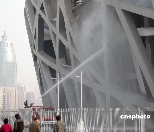 11月14日, 國家體育場“鳥巢”的鋼結構迎來了北京奧運會結束后的第一次全面清洗。負責此次清洗任務的奧林匹克中心區消防支隊出動了兩輛消防車及68米的云梯,使用高壓水槍進行清洗作業。預計整個“鳥巢”的清洗工作大約需要1周的時間。中新社發 玉龍 攝