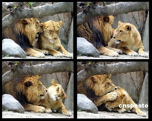 2008年11月18日,上海動物園內的兩只獅子在互相依偎取暖。一股較強冷空氣正在氣勢洶洶南下,17日開始影響申城。來自上海氣象部門的消息,這股冷空氣將給申城帶來明顯大風降溫,過程降溫幅度6-8℃,19日和20日早晨最低氣溫將跌至5℃左右,有霜或暗霜。中新社發 井韋 攝