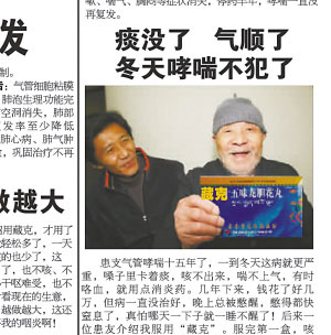 “患友介紹我服用了‘藏克’。服完第一盒,咳嗽、胸悶就緩解多了。”昨天(22日),看著我市(重慶市)某報(bào)上的一則藥品廣告,90歲高齡的老人張治欽感到納悶,“我從來沒得過這病,卻上了該藥的宣傳廣告。”
