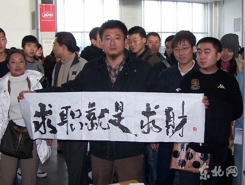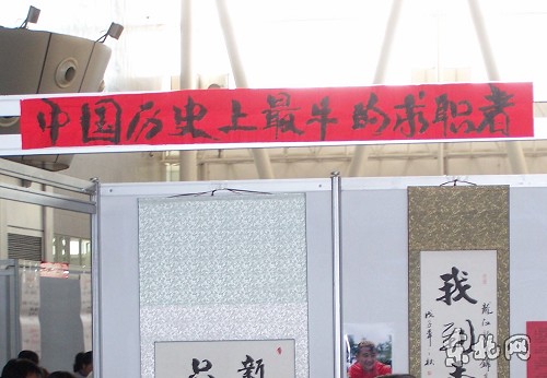 11月22日在哈爾濱國際會展中心舉辦的大型招聘會上,一個掛滿字畫的展位引起眾人和媒體的注意,并非招聘而是求職,展位中一位近四十歲的男子自詡“史上最牛的求職者”,大膽放言“給我5000元,使你成為百萬富翁”,在眾多企業當中周旋著尋找自己的伯樂,而這位“最牛求職者”對伯樂的要求還挺高,必須是女性,而且是越年輕越漂亮越好。并對記者稱,希望同時為四位雇主服務,減少不良雇主對他的傷害。