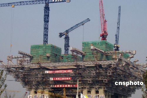 2008年11月25日,正在建設中的上海世博會中國館已初露雄姿,據悉計劃2009年年底竣工。 中新社發 周東潮 攝