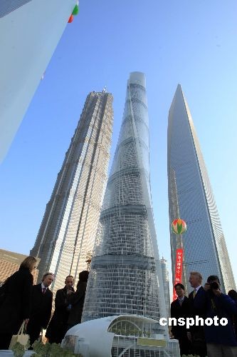11月29日,中國第一高樓——“上海中心”在上海陸家嘴金融貿易區腹地開工,該超高層建筑總高度將達632米,將與毗鄰的超高層建筑“金茂大廈”、“環球金融中心”,形成“三足鼎立”美景,圖為開工儀式上,中外嘉賓搶先觀賞這一“上海新景觀”。據介紹,“上海中心”總投資額預估高達148億元人民幣,外觀螺旋造型象征中國和諧的文化精神。預計2012年結構封頂且部分投入運營,2014年竣工交付使用。中新社發 潘索菲 攝
