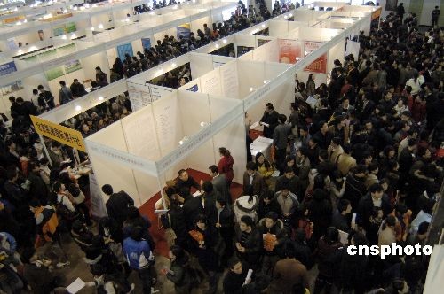 11月29日,大型部委聯合招聘會在北京中國國際展覽中心舉行,中科院、時代集團、中國日報社、百度等700多家單位招攬人才,近萬個工作崗位令求職者趨之若騖。據悉,金融危機下的就業形勢不容樂觀,許多應屆畢業大學生主動降低薪酬期望值,以期盡快就業。中新社發 徐曦弋 攝