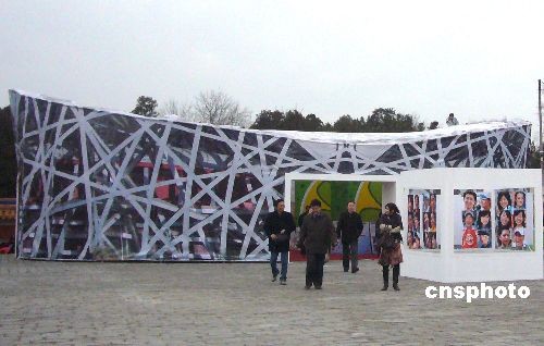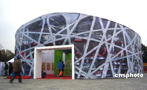 2008年12月3日,由噴繪布模擬搭建的山寨版“鳥巢”展廳正式在北京地壇書市的方澤壇活動區(qū)亮相,游客競相入內(nèi)參觀。不過這個建筑可不是用來進行體育比賽的,本屆書市的展覽、法律咨詢等活動都在這里進行。中新社發(fā) 玉龍 攝