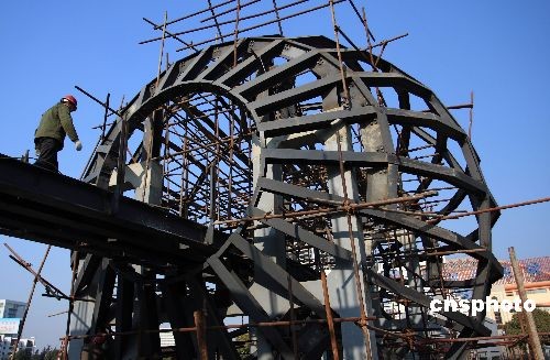 2008年12月14日,江蘇省淮安市南北地理分界線標志工程中的主體標志球已經成形,人行通道欄桿也已安裝,工人們正在全力施工,力爭年底前工程竣工。中新社發 徐洪云 攝