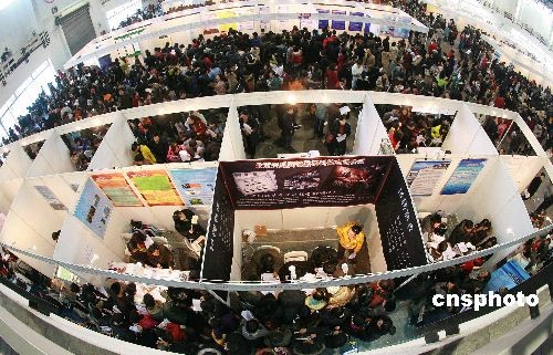 12月14日,2009年北京地區畢業研究生專場供需見面、雙向選擇招聘會在中國國際展覽中心舉辦,本次招聘會有700余家單位參會,提供14228個崗位,其中碩士學歷需求人數占總需求人數的92.4%,博士學歷需求人數占總需求人數的7.6%。據介紹,當日參加招聘會的研究生免費入場,僅上午已經有兩萬多名研究生前來應聘。中新社發 陳曉根 攝