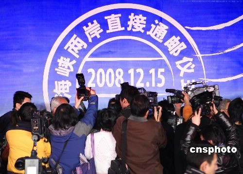 12月15日,由國家郵政局、國務院臺灣事務辦公室、北京市政府主辦、中國郵政集團承辦的海峽兩岸直接通郵儀式,標志著海峽兩岸將實現全面、直接、雙向通郵,直接開辦各項郵政業務。大陸方面郵件封局為北京、上海、廣州、福州、廈門、西安、南京、成都,臺灣方面郵件封局為臺北、高雄、基隆、金門、馬祖。圖為通郵儀式吸引眾多境內外記者爭相采訪。中新社發 宋吉河 攝