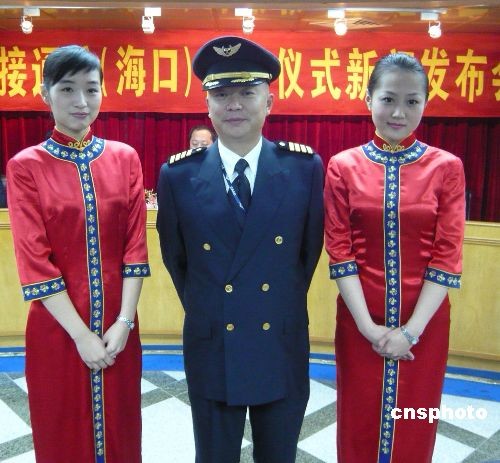 十二月二十日,海口-臺北將首開直航航線。海南航空為順利完成此次首航,特別推出精干的機組人員。機長蒲明(中)曾執飛2005年兩岸春節包機最后一個航班。乘務長和頭等艙乘務員在去年以來都曾執飛過兩岸中秋、春節包機。中新社發 王辛莉 攝
