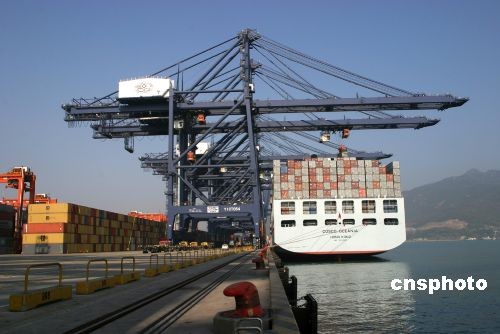 十二月十九日,深圳鹽田國際集裝箱碼頭首次迎來兩岸大三通后的直航集裝箱船舶──“中遠大洋州”號,它在十八日駛離臺灣高雄港后,經過十四小時的航行抵達鹽田!爸羞h太平洋”號運載力為一萬二十標箱,在鹽田靠泊約八小時。鹽田是兩岸七十四個直航港口之一。中新社發 方衛 攝