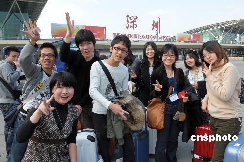 十二月二十一日,日本青少年世代友好代表團(tuán)一行百余人抵達(dá)深圳,他們將前往紅樹林、錦繡中華、民俗文化村、深圳大學(xué)、大族激光等處參觀。圖為日本大學(xué)生抵達(dá)深圳機(jī)場(chǎng)時(shí)高興地合影留念。中新社發(fā) 陳文 攝