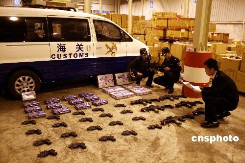 近日,寧波海關(guān)在貨運(yùn)渠道查獲512支國家禁止進(jìn)出境仿真槍,目前該批仿真武器已移交有關(guān)部門處理。據(jù)了解,該批仿真槍外殼為黑色硬塑料,部分內(nèi)部機(jī)件為金屬制,槍支彈匣、瞄準(zhǔn)器、消音器、紅外鐳射燈、BB彈等配件一應(yīng)俱全。中新社發(fā) 何蔣勇 攝
