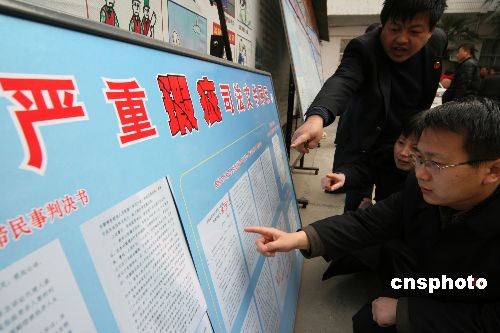 12月25日,法官在觀看有嚴重瑕疵的司法文書制成的展板。當日,為維護法院生效裁判文書的嚴肅性,提高法院的審判質量、司法文書制作水平,該市魏都區人民法院將本省近年來存在嚴重瑕疵的司法文書制成展板作為反面教材,在法院內部進行展示,教育廣大法官引以為戒,舉一反三,對照檢查自己在工作中存在的不足。中新社發 牛書培 攝