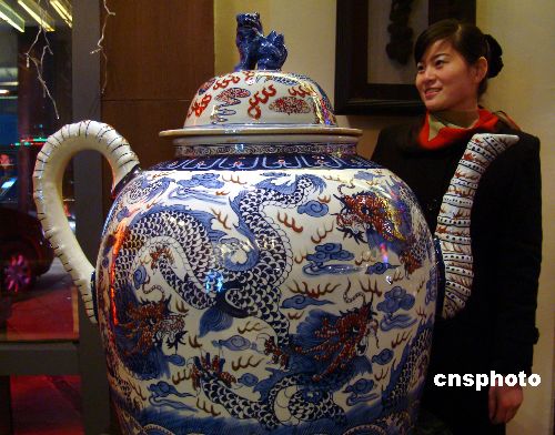 2009年1月2日,一名女士在觀賞景德鎮陶瓷巨壺。近日,一把可供300人同飲的景德鎮陶瓷巨壺在蘇州一家陶瓷商店亮相。據了解,這把陶瓷巨壺高約120厘米,壺身直徑約85厘米。中新社發 王建康 攝