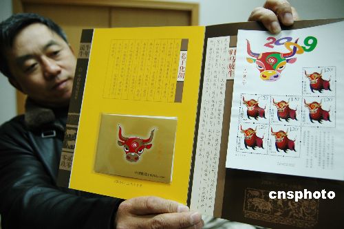 2009年1月4日,即將發行的《己丑年》特種郵票運抵蘇州。據悉,國家郵政局和中國郵政集團公司將于1月5日在蘇州首發該套以“奔!睘樾蜗蟮摹都撼竽辍诽胤N郵票。該次發行的《己丑年》郵票一套一枚,面值1.2元。郵票圖案為健壯倔強的奔牛形象,表現出奮力向前的視覺效果,寓意人們對生肖牛年的期望與寄托。中新社發 朱子寒 攝