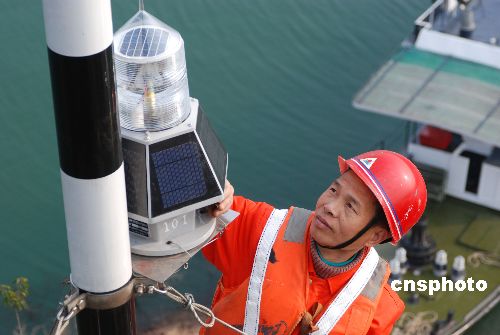 2009年1月8日,在三峽重慶庫區(qū)云陽段,航道管理人員在安裝新型太陽能航標燈。這種航標燈集太陽能光板、蓄電池、燈具于一體,視距更長、靈敏度更高、耐用性更好,可有效解決三峽庫區(qū)江面增寬和霧氣較大給船舶航行帶來的影響。目前,三峽庫區(qū)航道管理部門正在陸續(xù)更換,僅云陽縣就有30只新型太陽能航標燈在春運期間投入使用。中新社發(fā) 劉小洋 攝