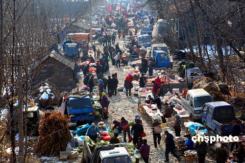 進入農歷臘月,中國山東一些農村集市逐步紅火,特別是春節臨近,山村集市上車水馬龍,一派“清明上河圖”景象。中新社發 宋吉河 攝