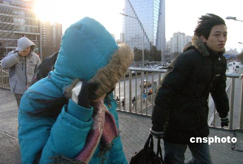 2009年1月22日,在京城東三環(huán)的跨線橋上,行人冒著寒風(fēng)趕路。此前北京市氣象臺第二次發(fā)布寒潮藍(lán)色預(yù)警,北京市將刮起4到5級北風(fēng),最高溫降幅將達到10℃左右,周五凌晨平原地區(qū)最低氣溫將降至-14℃。中新社發(fā) 馬毅行 攝