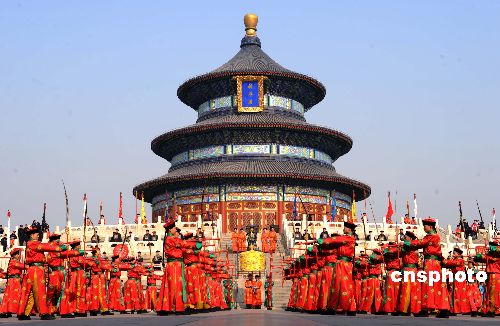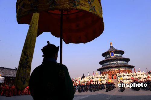 1月28日,北京天壇的祭天盛典。北京天壇公園從農歷大年初一至初五推出祭天樂舞和儀仗展演。演出陣容包括祭天樂舞239人和祭天儀仗280人,演出現場和周邊主要道路有五彩龍旗、云旗、刀旗等1500面,懸掛燈籠1000只,吸引大批中外游客前往觀禮。中新社發 廖攀 攝