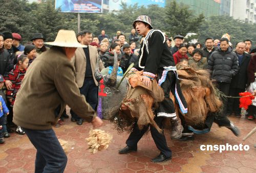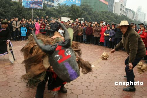 1月30日,農歷正月初五,四川省洪雅縣瓦屋山鎮復興村84歲村民毛清全帶領該村10多名村民,到眉山市城區表演當地民俗“牛兒燈”。