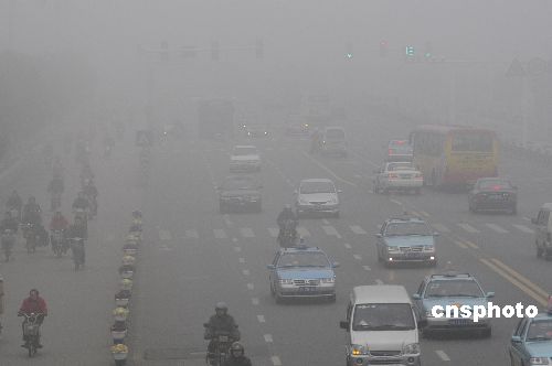 2009年2月1日,江蘇淮安街頭被大霧籠罩。當日是節后上班的第一天,也是農民工返城的高峰期,大霧給春運產生一定的影響。中新社發 賀敬華 攝