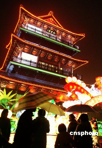 2009年2月2日晚,江蘇省鹽城市在剛落成不久的鹽鎮風情文化水街開始舉辦首屆新春燈會,主題為“盛世中華和諧鹽城”。用“龍騰盛世”、“鶴鹿同春”等一組組流光溢彩的燈飾造型著力展現“東方濕地之都,仙鶴神鹿故鄉”的獨特風采。雖然有連綿的陰雨,市民賞燈的激情卻絲毫沒有削減,一個個打傘賞燈的身影游動在絢麗繽紛燈海中,使燈火點綴的仿古景區更添幾分情趣。中新社發 李根 攝