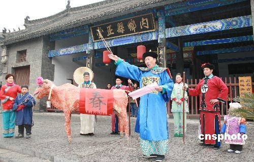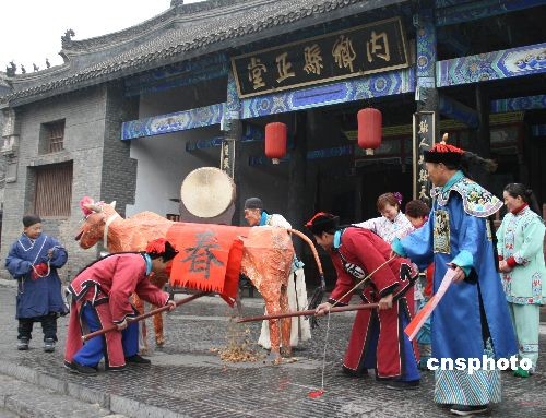 2月4日是立春節氣,在河南內鄉縣衙,身著清代服裝的工作人員,在表演“打春!惫澞。中新社發 張中立 攝