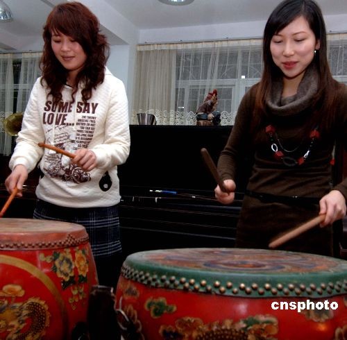 二月四日晚,二名女性觀眾在福建首家私人樂器博物館——福州宜天樂器博物館即興演奏“中古佳麗”民族大鼓。由福建一著名樂器收藏家創(chuàng)辦的福建首家私人樂器博物館共收納古今中西樂器逾千件,惹人流連。 中新社發(fā) 劉可耕 攝