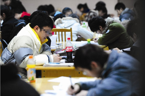 接連兩日,記者在該館自習室看到,眾多學子在伏案“奮筆疾書”,走近前去,才發覺他們大都是在專心致志地抄襲作業,有的對著一張復印的政治試卷猛抄,有的摁著一本練習冊狂抄……從年齡看,以中學生居多,也有不少小學生。