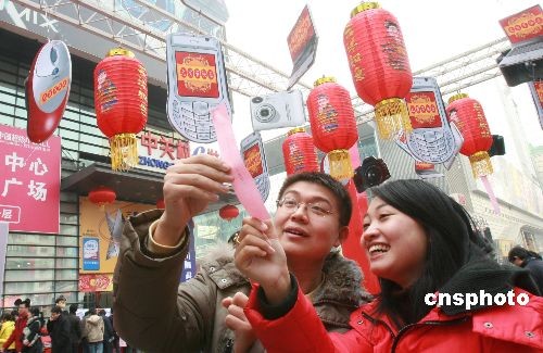 2月8日,人們在北京中關村競猜謎語。為迎接元宵佳節,北京中關村舉行元宵燈謎會,用“電腦”、“相機”、“鼠標”、“手機”等造型懸掛的燈謎,吸引了不少市民駐足猜謎。中新社發 陳曉根 攝