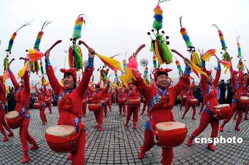 2月10日,在有“天下第一鼓”美稱的河北藁城市,上萬名當地市民把“戰鼓”搬到了廣場上,擊鼓狂歡慶新春。中新社發 鮑榮華 攝