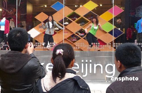 2009年2月21日,北京王府井某商場,兩位模特在櫥窗內激情表演動感十足的舞蹈,以此吸引過往行人的目光,為商場增添人氣。中新社發 玉龍 攝