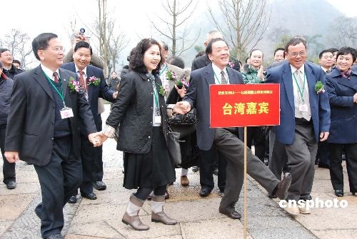 2009年2月24日上午,在浙江省杭州市天目山山腳下,天目山與阿里山的代表舉行了“杭州天目山——臺灣阿里山締盟姐妹山”合約簽字儀式,聯手推介旅游項目。在儀式現場代表們手拉手跳起了阿里山的傳統舞蹈。中新社發 姜越潮 攝