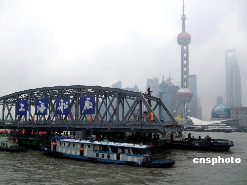 2月25日上午11時左右,經(jīng)歷四個多小時“回家之旅”的上海百年外白渡橋,到達黃浦江與蘇州河交匯口,在東方明珠面前完成一百八十度“轉身”。中新社發(fā) 鄭瑩瑩 攝