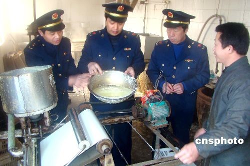 2月27日,江蘇連云港市連云工商分局執(zhí)法人員突擊行動,在連云區(qū)院前路當場端掉正在生產(chǎn)豆腐的兩個黑窩點。工商執(zhí)法人員當即查封了這兩家豆腐作坊,封存了生產(chǎn)工具,并責令限期整改。中新社發(fā) 王春 攝