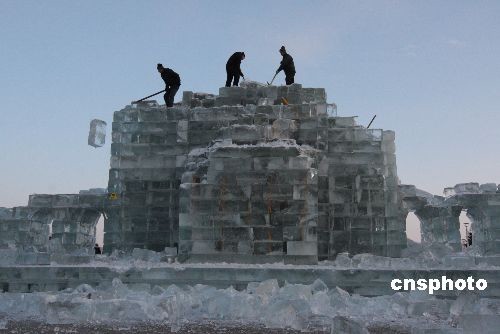 2月28日,施工人員在牡丹江市城區冰堡旅游景點拆除融化的冰雕作品。“立春”過后,素有“雪城”之稱的黑龍江省牡丹江市氣溫回升較快,城區內的各大冰雪旅游景點的冰雪作品開始融化,失去寒冬里的風采。從當日起,城區冰雪旅游景點管理部門對融化的冰雕作品進行拆除。中新社發 莊文斌 攝