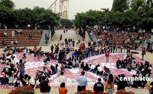 三月一日,為慶祝“三八”婦女節的即將到來,三百多名女士齊聚廣州長隆歡樂世界挑戰“人肉多米諾”骨牌。圖為蝴蝶形狀的骨牌圖案逐漸散開,場面壯觀。中新社發 劉衛勇 攝